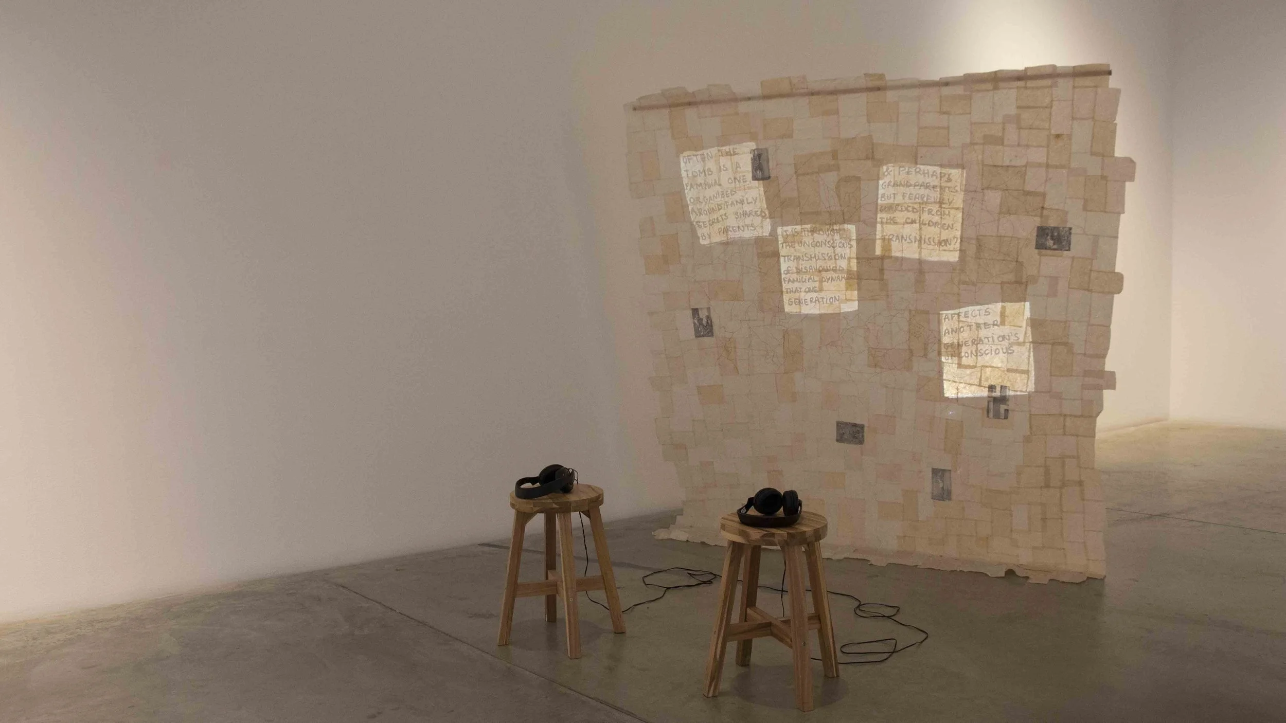 She has been transcribing those research into a multi channel installation layered onto a tea bags screen. The dialogue established between the projected image and the screen made of tea bags (a reference to the shared moments with her family as she interviewed them on the memories they have about this subject) aims to create a third space in which the stories can be materialized.
